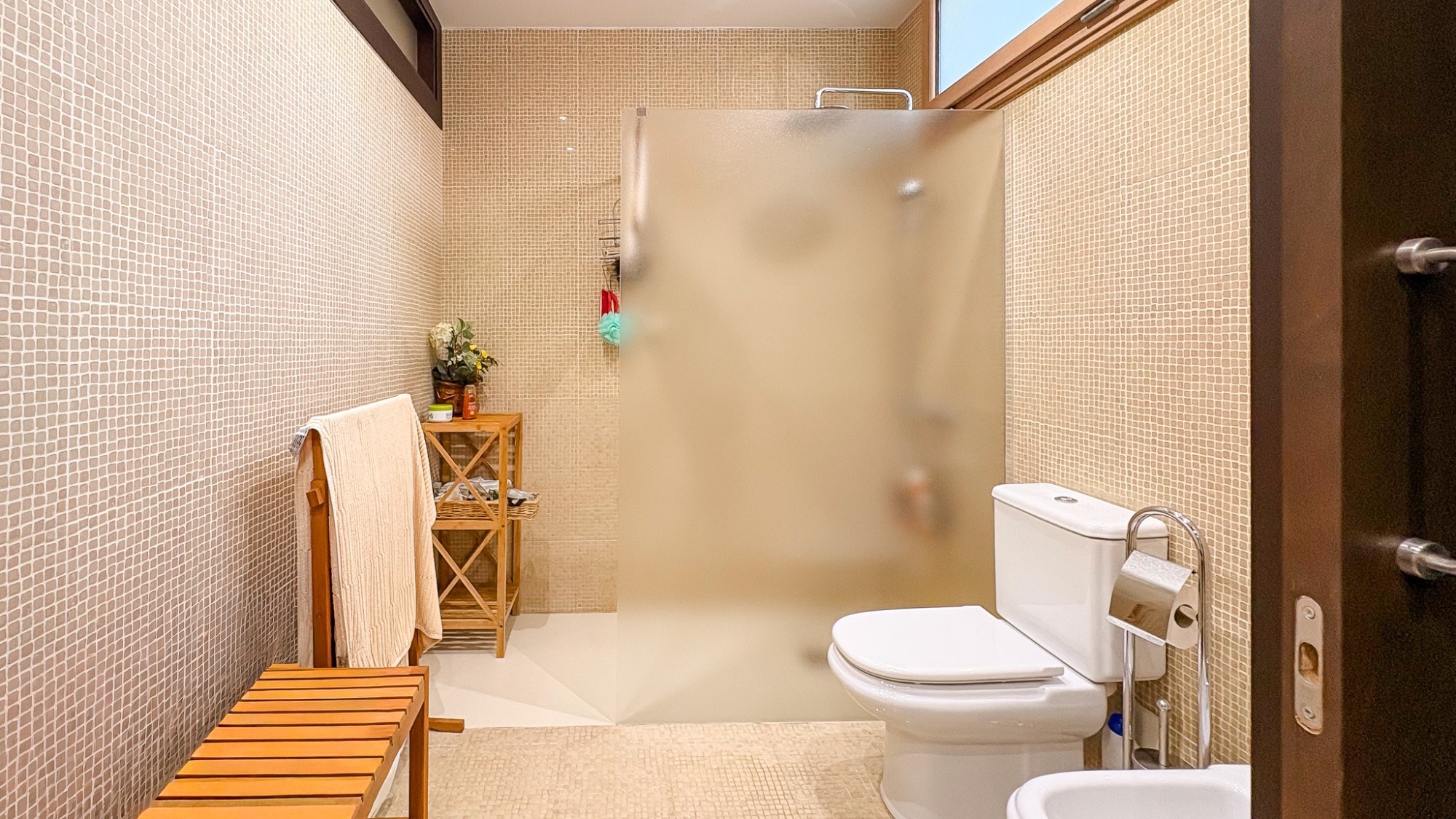 Op de eerste verdieping bevindt zich een ruime suite met eigen badkamer , grote ramen en toegang tot een privéterras op het zuiden , ideaal om te genieten van de zon en privacy.